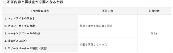 検査項目のうち「ヘッドライトの明るさ」「フロントタイヤの角度」「パーキングブレーキの効き」の3項目で基準を満たす値に書き換えが行われ、「排気ガスの成分」「スピードメーターの精度(誤差)」は検査を実施していなかった。