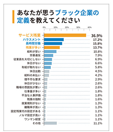 ブラック企業の定義を尋ねたところ、「サービス残業」(36.9%)と答えた人が最も多かった。次いで「ハラスメント」(17.2%)、「長時間労働」(15.8%)、「残業が多い」(13.7%)という結果に。残業代が支払われないことを否定する意見と、残業自体を否定する意見が目立った。
