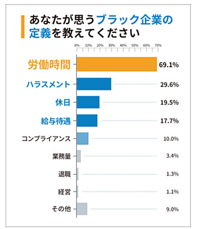 ブラック企業の定義をカテゴリー別に見て、「労働時間」を挙げた人からは「残業代は30分ごとに出るが、強制的に29分でタイムカードを切らされる」「上司から『サービス残業ではなく、思いやり残業だと思って仕事しろ』と言われた」といった声があった。「ハラスメント」と答えた人からは、「昇格制度について質問をすると、昇格には『上に媚びること』と言われた」「社内全体会議の司会進行には、必ず若手女性社員がアサインされる」などの意見があった。
