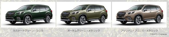 ボディカラーはグレードによって異なり、「カスケードグリーン・シリカ」「オータムグリーン・メタリック」「ブリリアントブロンズ・メタリック」が新たに加わった。