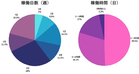 稼働日数(週)は「5日」が28%と最も多く、週7日休みなく働く人も約2割いた。労働時間(日)は「1〜3時間」が49.5%で、およそ半数が1日3時間以内の稼働時間だった。本業の合間に無理なく働く副業系フリーランスが多いことがうかがえる。