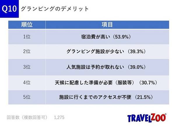 一方でグランピングのデメリットは、1位が「宿泊費が高い」(53.9%)、次いで「グランピング施設が少ない」(39.3%)、「人気施設は予約が取れない」(39.0%)だった。体験したい気持ちはあるが、予算の兼ね合いや施設が少ないことをデメリットと感じる人が多いことが分かる。