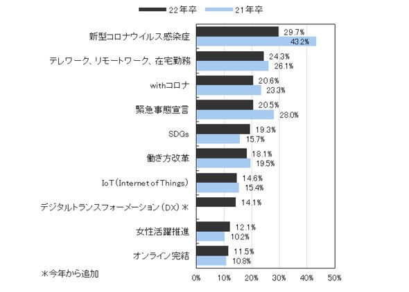 就職活動に影響したニュースワードの1位は「新型コロナウイルス感染症」(29.7%)で、2位は「テレワーク、リモートワーク、在宅勤務」(24.3%)、3位は「withコロナ」(20.6%)、4位は「緊急事態宣言」(20.5%)、5位は「SDGs」(19.3%)、6位は「働き方改革」(18.1%)という結果に。