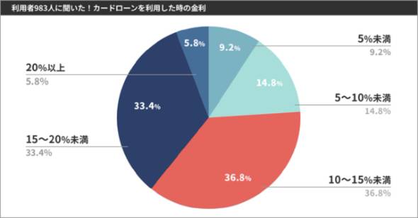 借り入れ時の金利で最も多かったのは10〜15%で全体の36.8%だった。また、18%と回答している人が最も多く、上限金利を18%に設定しているカードローン会社では、利用者の多くが最も高い18%で借りている。