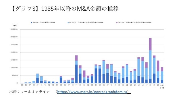 これを見ると、日本企業による外国企業へのM&Aの金額が非常に大きくなっていることが見て取れる。海外M&Aの件数は、その年に発生するM&Aの25〜35%程度であるが、大企業による海外企業のM&Aは大規模なものが多く、金額ベースで集計するとこのようなグラフになるのである。ちなみに、日系企業によるM&Aで過去最大のものは、18年に武田薬品工業が手掛けた英・製薬会社シャイアーの買収で、買収金額は6兆2000億円だ。まさに社運を賭けたM&Aといってよいだろう。