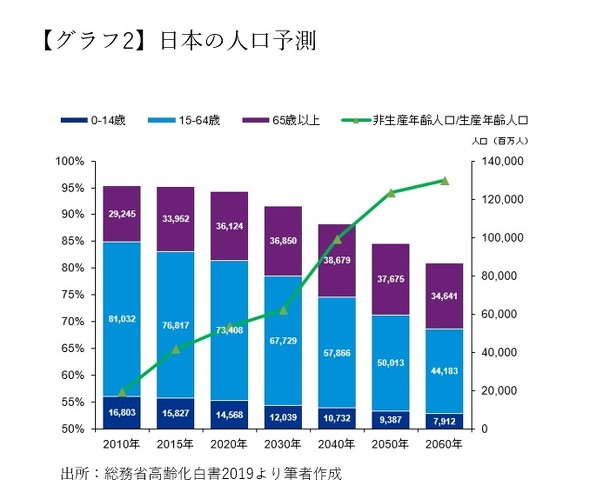 中小・零細企業の後継者難の問題も深刻だが、それ以上に大きな問題がある。それは後継者どころか、日本人の次世代人口そのものが減少する問題だ。15年から日本の人口は減少に転じた。そしてこの減少のスピードはすさまじく、グラフ2が示すように、今後40年で約4000万人が減少すると予測されているのだ。