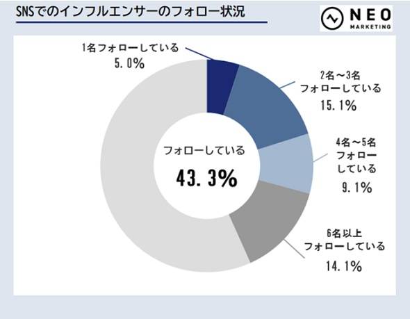 SNSで何人のインフルエンサーをフォローしているか聞いたところ、43.3%が少なくとも1人はフォローしていることが分かった。「1人フォローしている」は5.0%、「2〜3人」は15.1%、「4〜5人」が9.1%、「6人以上」が14.1%と、複数人フォローしている人が多かった。