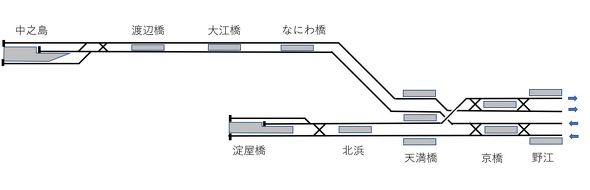 そこで、天満橋から分離する新線を建設し、もうひとつのターミナルを作れば列車を分散できる。ここで京阪電鉄は、なにわ筋線計画の中之島駅に注目した。中之島まで線路を作れば、淀屋橋駅で御堂筋線に連絡したように、中之島駅でなにわ筋線に連絡できる。