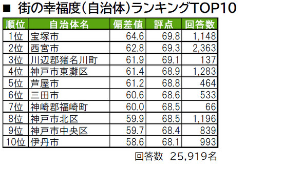 街の幸福度(自治体)ランキングの1位は宝塚市、2位は西宮市、3位は猪名川町だった。