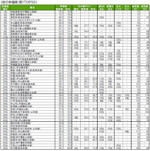 街の幸福度(駅)ランキング1位は神鉄道場(神戸電鉄三田線)、2位は畦野(能勢電鉄妙見線)、3位は清荒神(阪急宝塚線)だった。