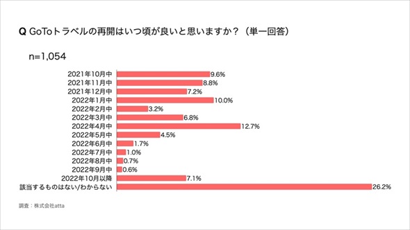 「Go To トラベルの再開はいつ頃が良いと思うか?」という問いで一番多かったのは「該当するものがない/わからない」の26.2%で、2位に「22年4月中」(12.7%)、3位に「22年1月中」(10.0%)が続いた。「年内(21年10月〜12月)」と答えた人は回答者の4分の1(25.6%)ほどで、多くの人は早急な再開を期待しているわけではないことがうかがえる。