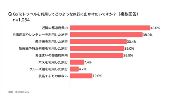 「Go To トラベルを利用してどのような旅行に出かけたいか」を聞いたところ、「近隣の都道府県内」(43.0%)、「自家用車やレンタカーを利用」(38.9%)という回答が多かった。交通手段では「飛行機」「新幹線・特急列車」、行先では「住んでいる都道府県内」も人気が高く、「バス」「クルーズ船」の利用を挙げる人は少なかった。