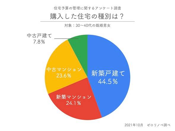 購入した住宅の種別は何か尋ねた。1位は「新築戸建て」(44.5%)、次いで「新築マンション」(24.1%)、「中古マンション」(23.6%)、「中古戸建て」(7.8%)と続いた。