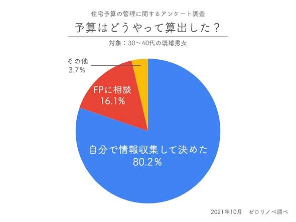 住宅購入予算の算出方法は、「自分で情報収集して決めた」(80.2%)と「ファイナンシャルプランナーに相談した」(16.1%)が9割以上を占める結果に。「その他」には「知人からアドバイスを受けた」「両親が決めた」などが挙げられた。
