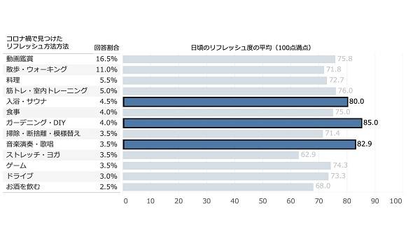 5位の「入浴・サウナ」(リフレッシュ度80.0点)、7位の「ガーデニング・DIY」(同85.0点)、9位の「音楽演奏・歌唱」(同82.9点)など、汗かき発散系のリフレッシュ度が高いことが示された。