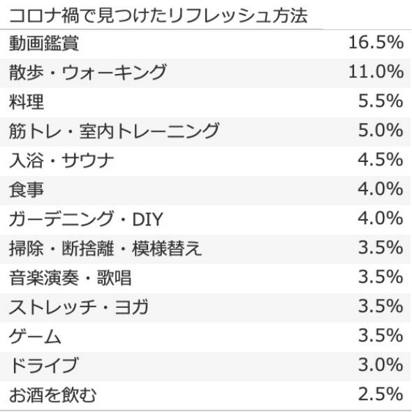 コロナ禍で新たに見つけたリフレッシュ方法は何か尋ねた。最も多かったのは「動画鑑賞」(16.5%)、次いで「散歩・ウォーキング」(11.0%)、「料理」(5.5%)だった。
