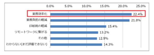 一方、電子署名サービスを導入していると回答した人に、サービス導入により評価している点について尋ねると、「業務効率化」が22.4%、「業務負担の軽減」が21.8%となった。