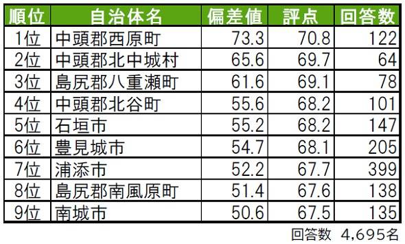 街の幸福度(自治体)ランキングの1位は、「住みここちランキング」では9位の「西原町」だった。