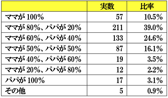 夫婦の家事分担のおおよその負担割合を尋ねた。女性の回答では、「ママが80%、パパが20%」(45.9%)が最も多く、「ママが100%」(26.8%)、「ママが60%、パパが40%」(14.2%)と続いた。男性の回答では、「ママが80%、パパが20%」(39.0%)が1位で、2位は「ママが60%、パパが40%」(24.6%)、3位は「ママが50%、パパが50%」(16.1%)だった。