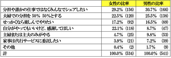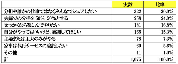 家事についての理想のスタイルは、「分担や誰かの仕事ではなくみんなでシェアしたい」(30.0%)が1位で、2位は「夫婦での負担を50% 50%とする」(24.0%)、3位は「せっかくなら楽しんでやりたい」(16.8%)だった。男女別で見ると、女性は「自分がやってもいいど、感謝してほしい」(22.1%)が3位になった。