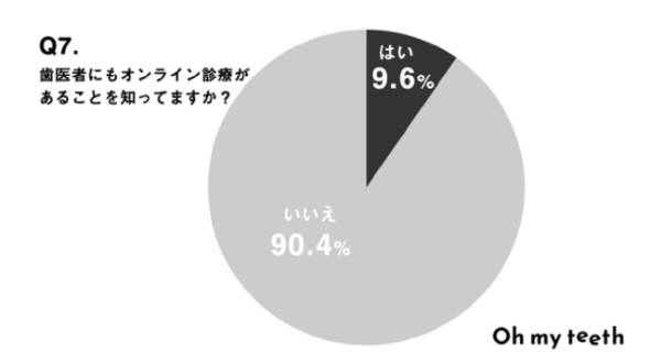 最後に、歯医者にもオンライン診療があることを知っているか尋ねると、「知っている」と回答したのはわずか9.6%となった。歯医者では「歯や口の中の不調に関する相談」「歯並びの相談」「歯磨き指導」などの診療で利用できるが、まだまだ普及していないことがうかがえる結果となった。