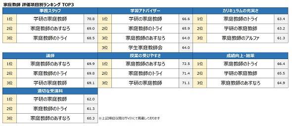 2位は、評価項目7項目全てで3位以内にランクインした「家庭教師のトライ」、3位は項目別の「講師」と「授業の受けやすさ」で1位となった「家庭教師のあすなろ」だった。