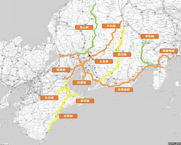 東海道線の豊橋と中央線の辰野駅を結ぶ長大なローカル線だ。豊橋〜新城間21.6キロメートルの運行頻度が高く、豊橋もしくは名古屋への通勤圏、新城〜本長篠間が次に多い。