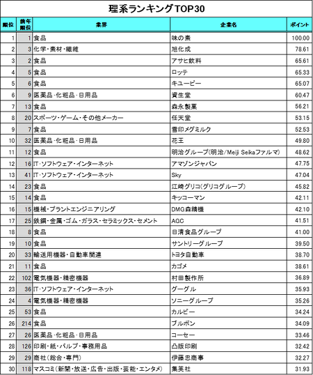 理系1位は「味の素」、2位は「旭化成」、3位は「アサヒ飲料」という結果に。4位「ロッテ」、5位「キユーピー」など食品系の企業が上位10位に6社ランクインした。30位以内でも食品系の企業が14社と人気の高さがうかがえる結果となった。
