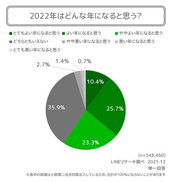 22年はどんな年になると思うか聞いた。「とても良い年になると思う」が10.4%、「良い年なると思う」が25.7%、「やや良い年になると思う」が23.3%と、合わせて59.4%が良い年になるだろうと答えた。良い年になると答えた割合は昨年より10.3ポイント増加した。