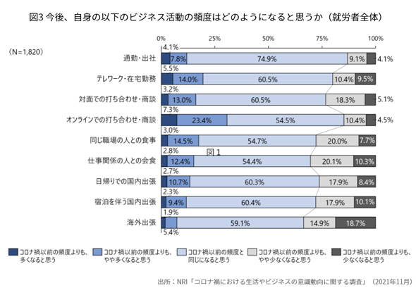 ビジネスパーソンに通勤やテレワーク、会食、出張などの頻度に見直しがあるかを聞いたところ、「コロナ禍以前の頻度と同じになると思う」「コロナ禍以前の頻度よりも多くなると思う(「やや多くなる」を含む)」を合わせた回答は、各7〜8割だった。