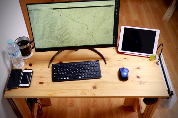 私のミッションは、気候変動などによる世界の水リスクの予兆を捉えるための技術体制を構築することです。地下水の流れを解析するためのパソコンなど、目的に応じて複数の端末を使い分けています。複数の端末を収納・整理しやすいように、近所で購入したクリアボックスをDIYで作ったデスクに取り付けています。現地調査で、地下水を育む山にも出向く機会がありますが、それが高じて“山好き”になり、今ではマウンテンバイクで近くの山に行くことが趣味のひとつです。平日は子どもの保育園の送迎自転車として使用することもあります。