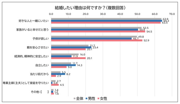 結婚したい理由を尋ねると、「好きな人と一緒にいたい」(63.9%)が最も多く、「家族がいると幸せだと思う」(52.5%)、「子どもが欲しい」(49.8%)と続いた。上位3項目について半数近くの人が回答していることから、同社は「結婚したい主な理由となっていることが分かる」とコメントした。