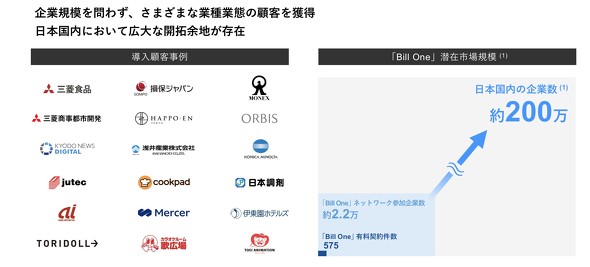 また、Bill One導入顧客がやりとりする相手を「Bill Oneネットワーク参加企業」と定義しており、日本国内の約200万社に広げることを目指している。11月末時点で、ネットワーク参加企業は2.2万社に達しており、「日本企業の1%に展開できた」(橋本宗之CFO)としている。
