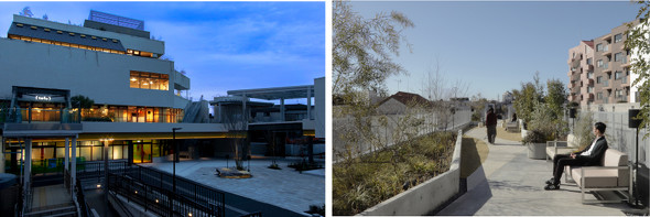 館内にとどまらず、屋外空間も生活の中の新たな居場所として楽しめる場となるよう、ベンチやグリーンを各所に配置した。2階デッキは空中に新しくできた路地をイメージした空間が、BONUS TRACKエリア(「下北線路街」のエリアの1つ)方面へと伸びて、街とつながるような設計にした。館内の内装は下北沢の街の雰囲気になじむよう、木の温かみを随所に取り入れ、すっきりしていながらも、気取りすぎず、親しみのある空間を意識した。
