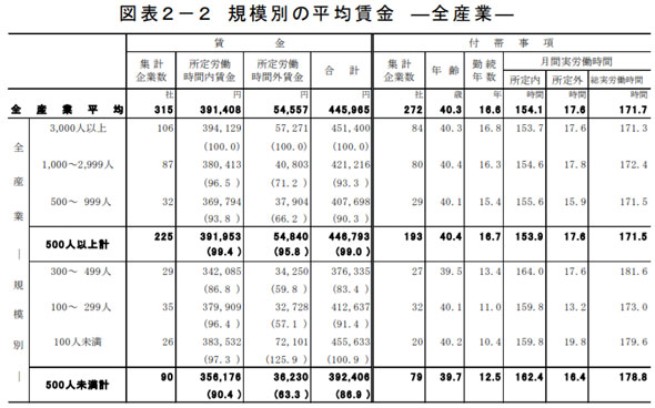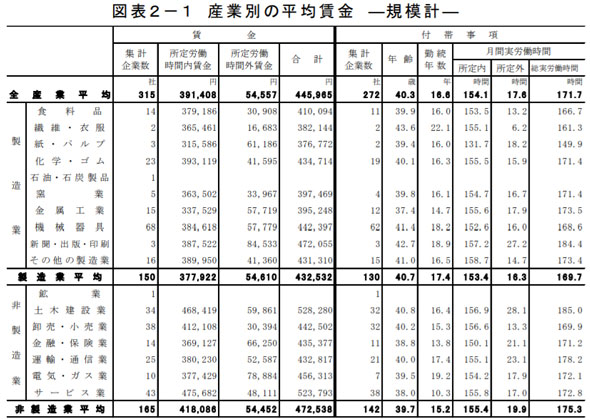 産業別に賃金をみると、全産業平均は39万1408円だった。製造業の平均は37万7922円、非製造業は同41万8086円で、非製造業平均が全産業平均を上回っている。