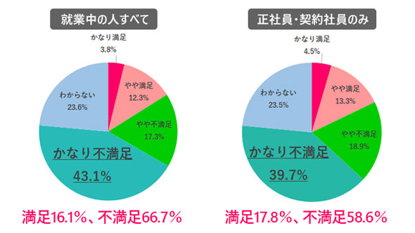 ボーナスの満足度は、「かなり不満足」が43.1%で1位。不満足派66.7%に対して、「かなり満足」と「やや満足」を選んだ満足派は16.1%の結果になり、約4倍の差がある。「正社員・契約社員」だけで見てみると、満足派17.8%、不満足派58.6%となり、やや満足に感じる人の割合が増えていた。