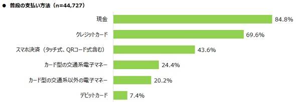普段の支払い方法は何かの問いに、1位は「現金」で84.8%、2位は「クレジットカード」で69.6%、3位は「スマホ決済(タッチ式、QRコード式含む)」(以下スマホ決済)で43.6%だった。