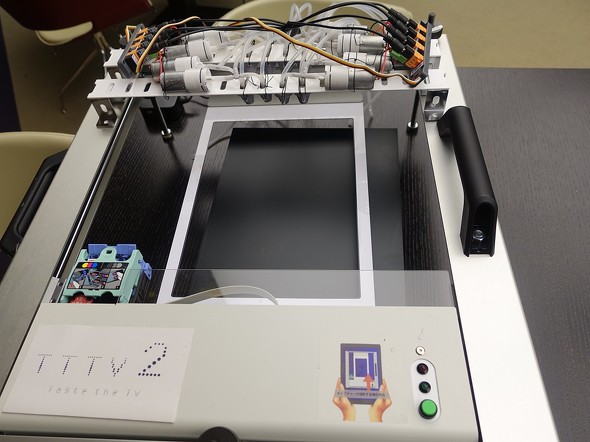 宮下: 液体をスプレーして混ぜる構造はTTTVと同じですが、食品用のフードプリンターと融合させました。ケーキに着色料で写真をプリントするときなどに使われるものです。例えば、クラッカーにピザの写真を、白米にちらしずしの写真を印刷するとともに、味もつけられます。