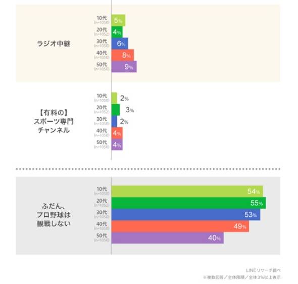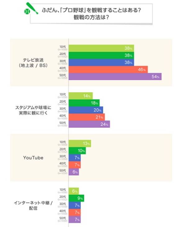 2位は「スタジアムや球場に実際に観に行く」が約20%で、3位は「YouTube」が10%弱だった。YouTubeは、他の年代と比べると10代が13.0%、20代が10.0%とやや高めだった。4位以降は、DAZN、TVer、パ・リーグLIVEなどだった。