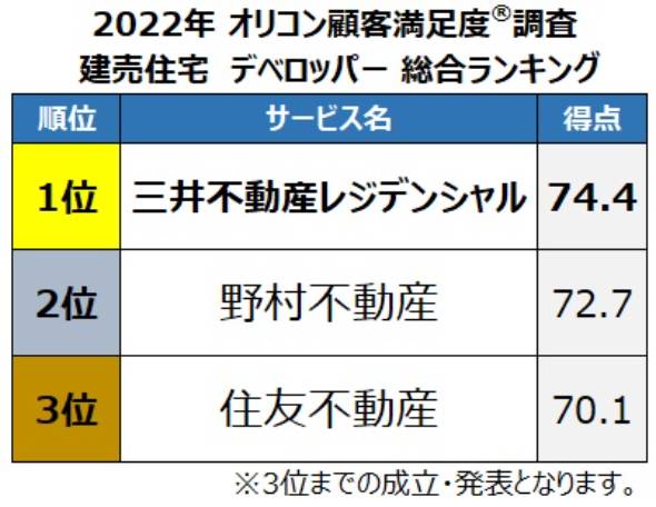 「建売住宅 デベロッパー」ランキングは、2年連続で「三井不動産レジデンシャル」(74.4点)が総合1位となった。10個の評価項目中「立地」「情報提供」「周辺環境」「引渡し時の住宅確認」「デザイン」「住宅構造・設計」「住宅設備」「金額の納得感」の8項目で1位になった。「立地」は3年連続で特に高く評価された。地域別では「関東」、男女別で「女性」、築年数別「2〜6年以内」「7〜10年以内」で1位を獲得した。