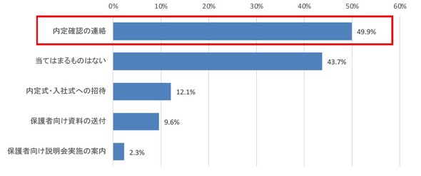 子どもが内定を得ている企業から、保護者にどのような連絡があったのかを聞いた。最も多かった回答は「内定確認の連絡」(49.9%)で、「当てはまるものはない」(43.7%)、「内定式・入社式への招待」(12.1%)、「保護者向け資料の送付」(9.6%)と続いた。マイナビは「学生への内定フォローだけでなく、保護者に向けたフォローを行う企業もあるようだ」と分析する。