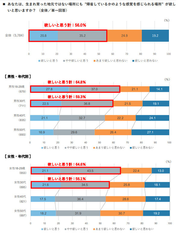 生まれ育った地元ではない場所でも「帰省しているかのような感覚」を味わいたい人は、56.0%。性年代別では、男女ともに30代以下が全体の値を上回り、その意向の高さがうかがえる。