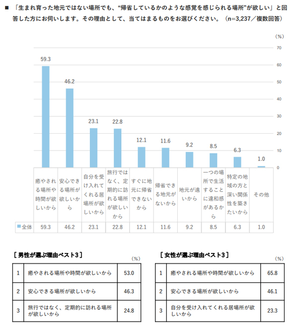主な理由は「癒やされる場所や時間」「安心できる場所」がほしいため。「癒やし」を求める意向は女性が高く、男性は「定期的に訪れる場所」を求める傾向にあった。