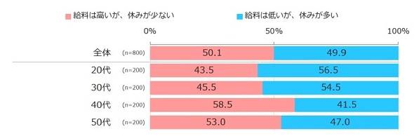 仕事の満足度と週休の関連性について聞いたところ、週休が多い人ほど仕事満足度が高い傾向にあることが分かった。また、「給料は高いが休みは少ない」「給料は少ないが休みが多い」のどちらがよいか聞くと、休み重視の回答をした人が49.9%で、給与重視が50.1%という結果に。20〜30代では「休み」、40〜50代では「給料」を重視する割合が高くなった。同社は「若手社員のエンゲージメント向上において『休み』は大切な要素であることが分かった」とコメントした。