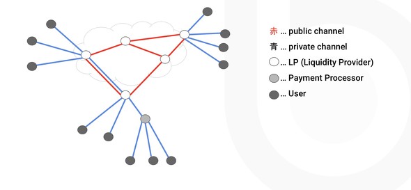 P2Pネットワークというと、メッシュ状の構造をイメージしがちだが、実際はノード間でチャンネルを作成、維持するにはコストがかかるため、ノードの構造はハブ構造に近くなる。多くのノードが接続するハブノードは、LP(流動性プロバイダー)と呼ばれる。