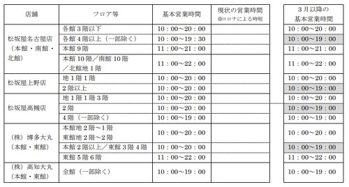 その他、大丸神戸店では2〜8階の開店時間を午前10時から午前11時に変更する。また、松坂屋名古屋店や上野店なども一部フロアの閉店時間を午後7時までと早めることにしている。なお、大丸札幌店、大丸芦屋店、松坂屋静岡店、高知大丸の営業時間は変更しない。