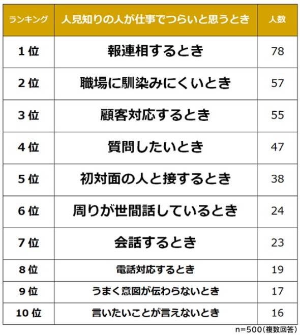 人見知りが原因で仕事がツライと思うのはどんなときか聞いた。1位は「報連相するとき」(78人)、2位は「職場になじみにくいとき」(57人)、3位は「顧客対応するとき」(55人)だった。