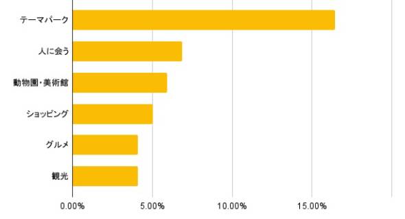 東京都でやりたいことや行きたい場所1位は「テーマパーク」、2位は「人に会う(友達、親戚、ライブ、イベントなど)」、3位は「動物園/美術館」、4位は「ショッピング」、5位は「グルメ」だった。同社は「コロナ禍で機会が減ってしまった中、『テーマパークに行きたい』という需要の高まりが見て取れる」と分析する。「好きなアーティストなどにオフラインで会える機会がなかった」「会えるイベントに行けなかった」「友達や親戚に会えていないので会いたい」といったコメントも寄せられた。