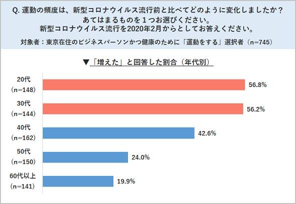 「増えた」と回答した割合を年代別で分析すると、20代が56.8%、30代が56.2%だった。若年層は他の世代より、運動する頻度を増やしたことが分かった。