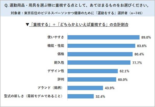 健康のために運動をすると回答した人に対し、運動用品・用具を選ぶ際に重視する点を聞いた。最も多かったのは「使いやすさ」(89.0%)、次いで「機能・性能」(83.6%)、「価格」(80.4%)という結果に。同社は「使い勝手・機能性を意識しながら価格も気にするというように、コストパフォーマンスが重要なポイントのようだ」と分析する。